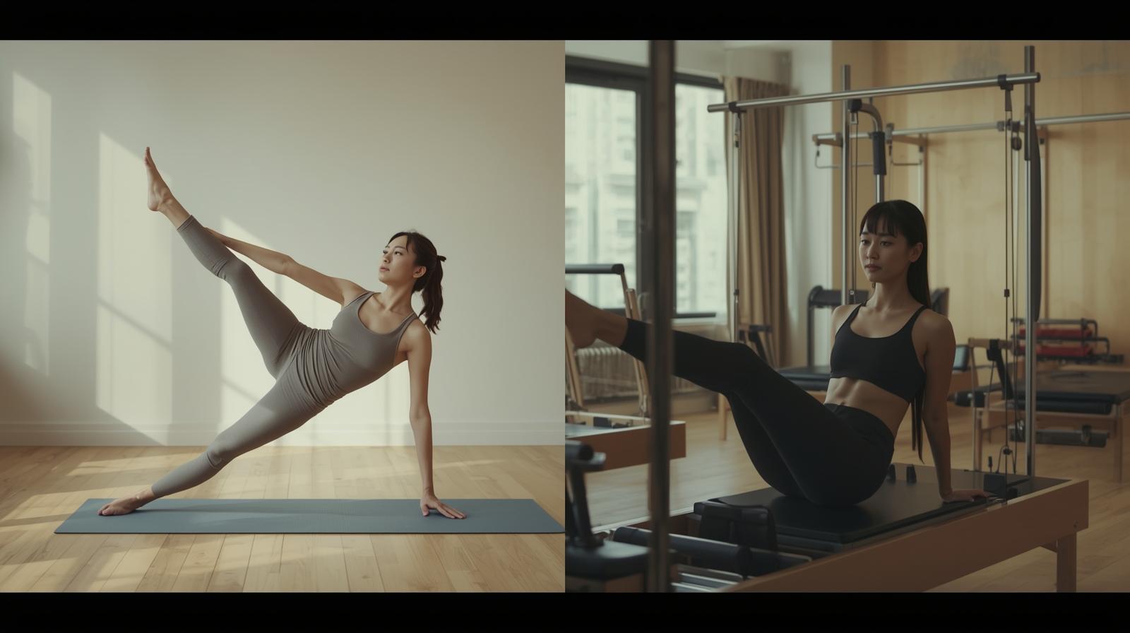 ヨガは腹式呼吸でリラックスを重視する側面が強く、ピラティスは胸式呼吸で体幹や姿勢改善に寄せやすい傾向があります。体の土台を作りたいならピラティス、静けさを深めたいならヨガ、で選ぶと分かりやすいです。